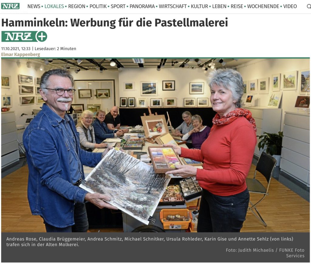 Dazu trafen sich neun Mitglieder der Pastellgesellschaft im Atelier von Michael Schnittker um sich intensiv mit der Pastellmalerei zu widmen. Unsere Malwoche endete mit einer Werksausstellung, die sehr viele Besucher anlockte. Ein Reporter bedachte uns dann am 11.10.2021 sogar mit einem Artikel in der Neuen Ruhrzeitung (NRZ), um für unsere Pastellgesellschaft zu werben.