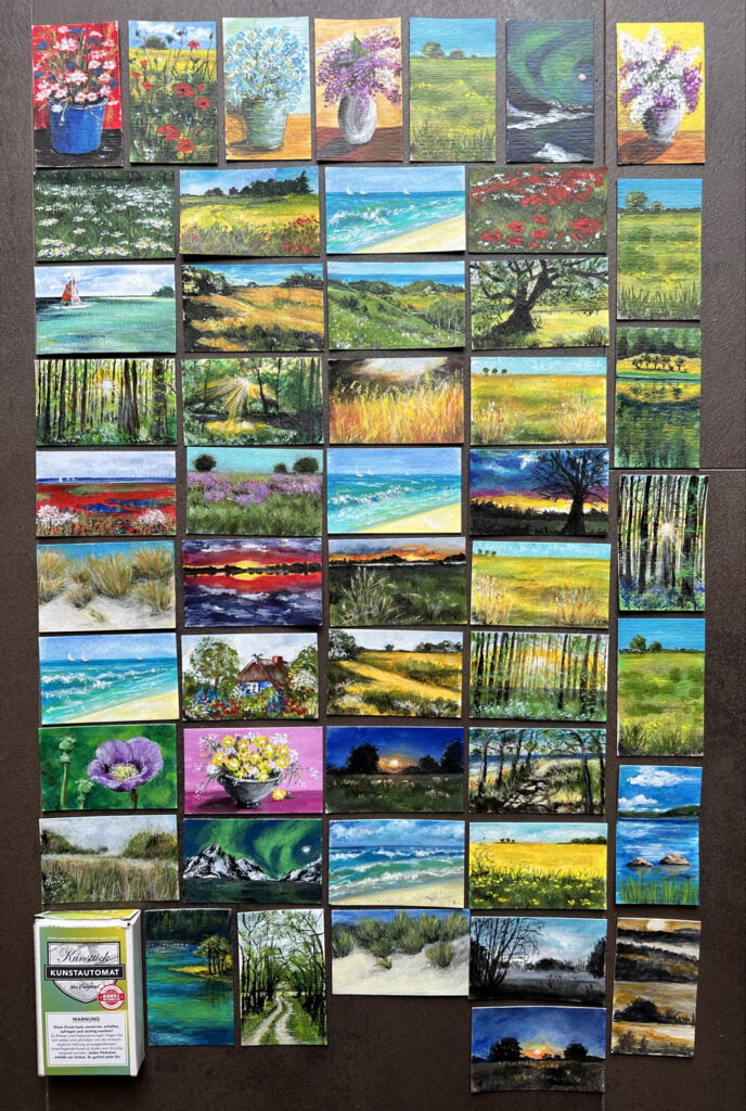 Am 03.02.2023 befand ich mich auf einer Malreise auf dem Darß (Ahrenshoop) und zog mir bei dem dortigen Kunstautomaten eine Kunstschachtel. Ich war begeistert, von dieser Idee, Kunst in kleine Schachteln zu stecken und andere Menschen zu erfreuen. Ich nahm sofort zu Lars Kaiser vom Büro Kunstautomaten-Potsdam Kontakt auf und begann mit dem Malen einer Menge Bildchen, die dann im April 2023 in Schachteln verpackt, auf die zahlreichen Kunstautomaten verteilt wurden. Im Juli erreichte mich dann per email diese Nachricht. Ich bin immer noch gerührt, wenn ich diese Zeilen lese…